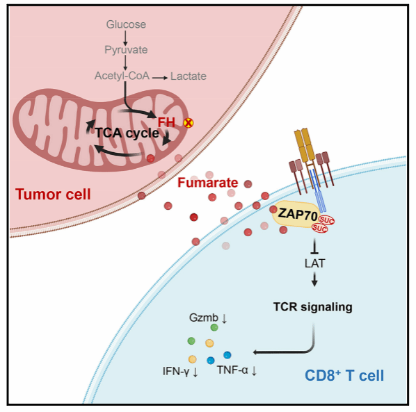 肿瘤细胞通过积累延胡索酸,抑制ZAP70-TCR信号通路,阻断CD8+ T细胞的抗肿瘤功能
