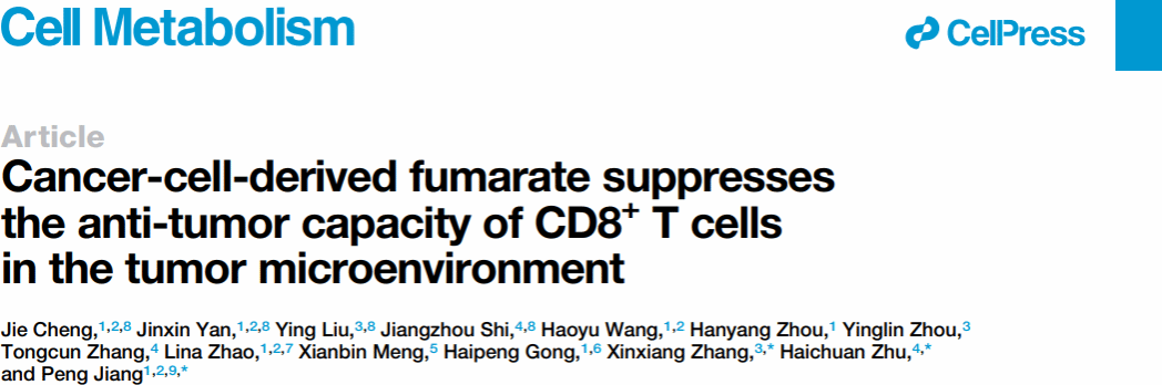 原文链接: J. Cheng, J.X. Yan, Y. Liu, J.Z. Shi et al., Cancer-cell-derived fumarate suppresses the anti-tumor capacity of CD8+ T cells in the tumor microenvironment. Cell Metabolism (2023). DOI: 10.1016/j.cmet.2023.04.017